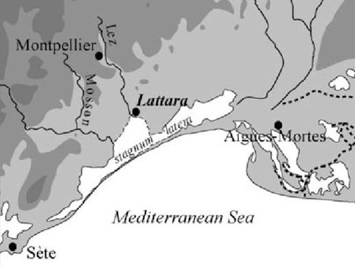 En 1963, on a découvert qu’à l’emplacement du village de Lattes (17000 habitants), à 4 km au sud de l’actuelle Montpellier et sur le fleuve Lez, se trouva dès l’Antiquité une cité portuaire étrusque du nom de Lattara, selon certains le premier port d’Europe occidentale.