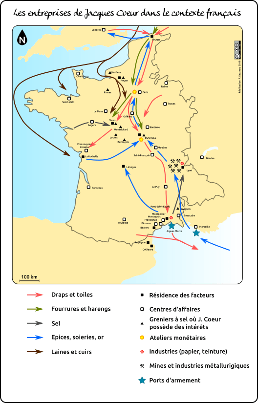 En 1430, Jacques Cœur, déjà réputé comme un homme « plein d’industrie et de haut engin, subtil d’entendement et haut comprendre ; et toutes choses, si haut fussent-elles, sachant conduire par son travail » [3], se lance dans le commerce en créant, avec Barthélémy et Pierre Godard, deux notables de Bourges, « une société en tout fait de marchandise et mesmement au fait du roy notre seigneur, de monseigneur le dauphin et autres seigneurs, et en toutes autres choses dont ilz pourraient faire proufitt ».