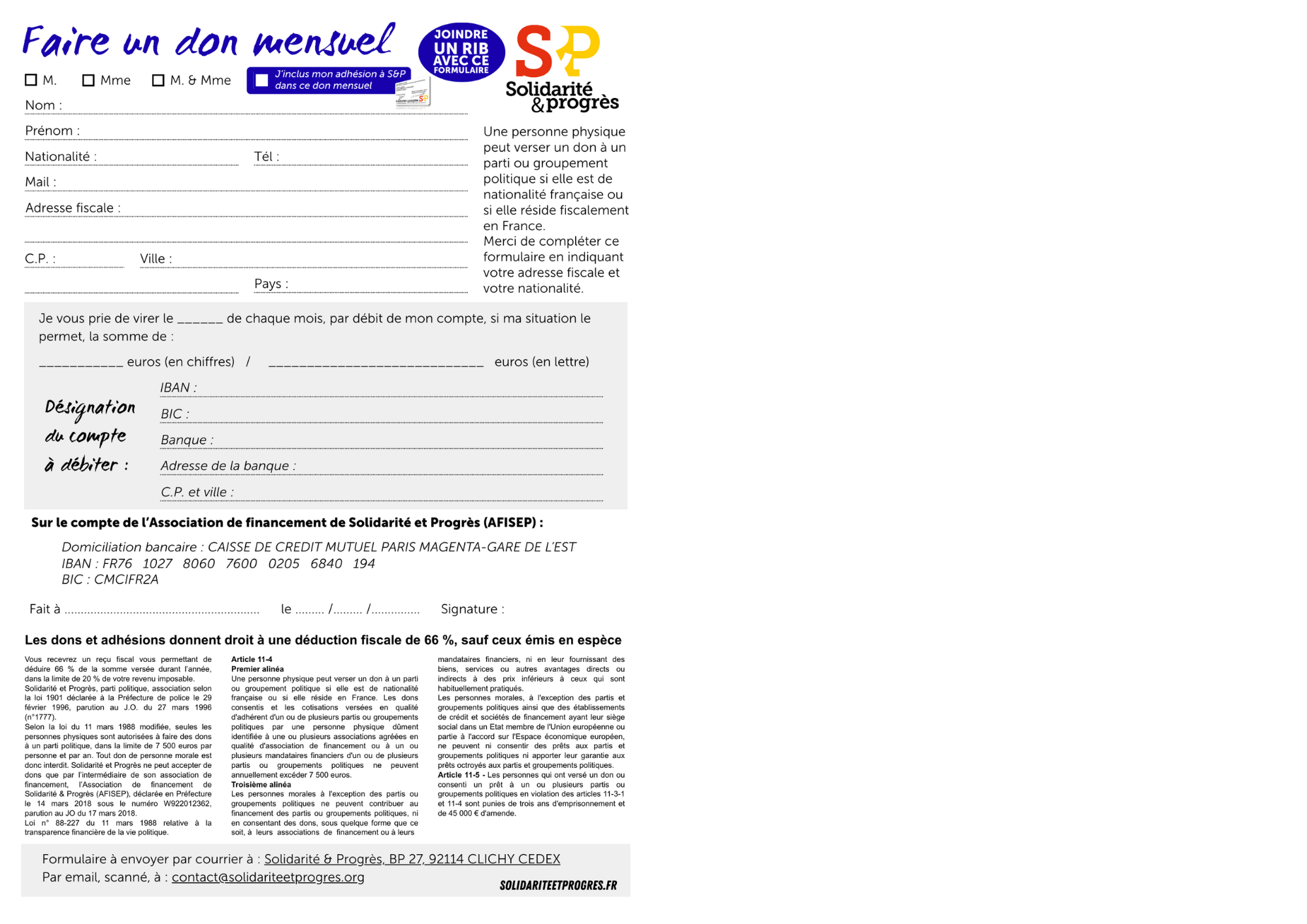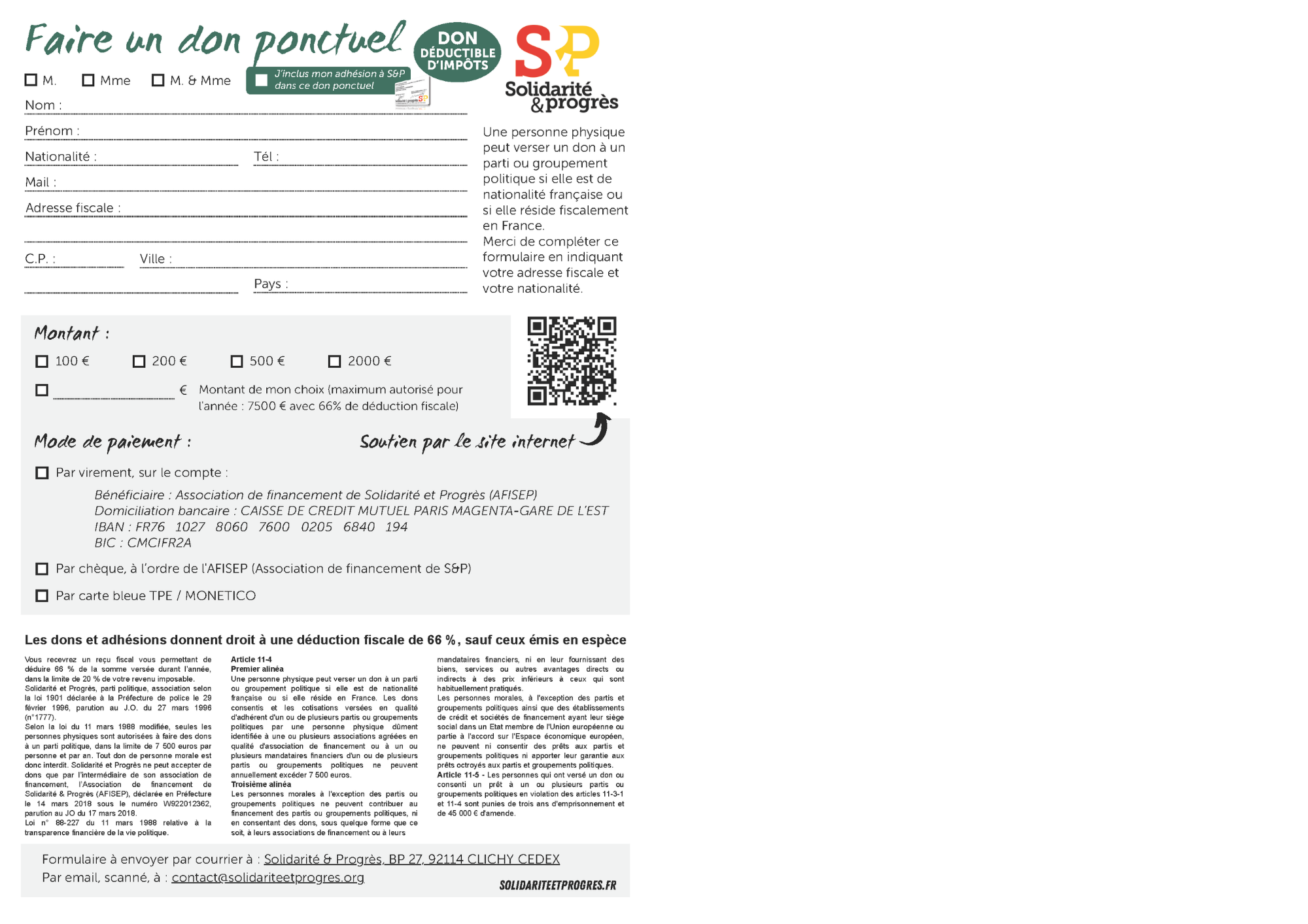 *Mentions légales concernant les dons à Solidarité et Progrès