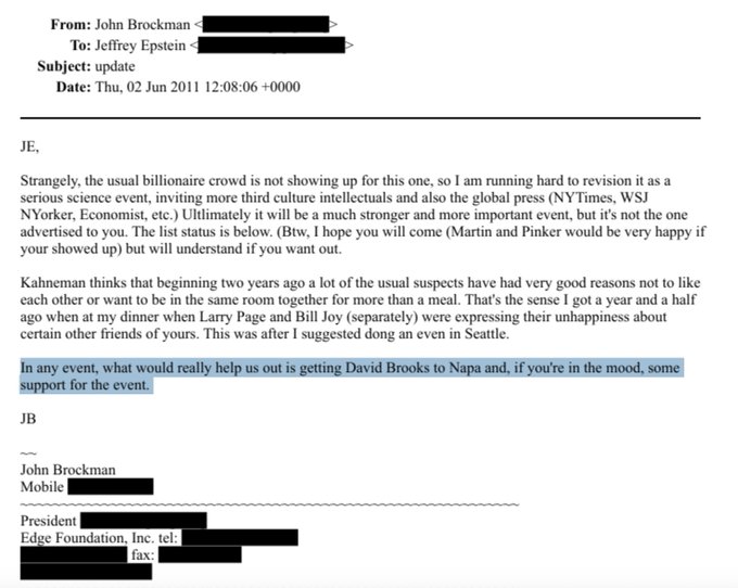 BuzzFeed News a analysé les déclarations fiscales de la Fondation Edge auprès du fisc américain (IRS) entre 2001 et 2017, publiées sur Nonprofit Explorer de ProPublica. Selon Evgeny Morozov, un ancien client de Brockman qui écrit sur les implications politiques et sociales des technologies, les fondations liées à Epstein ont versé 638 000 $ sur un total de près de 857 000 $ reçus par Edge durant cette période.