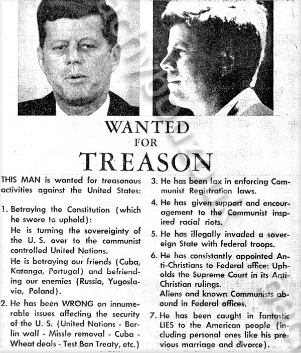 1) Il a trahi la Constitution. II a soumis la souveraineté des Etats-Unis à l’ONU, contrôlée par les communistes. II a trahi nos amis et favorisé nos ennemis, en particulier à Cuba, au Congo et au Portugal.