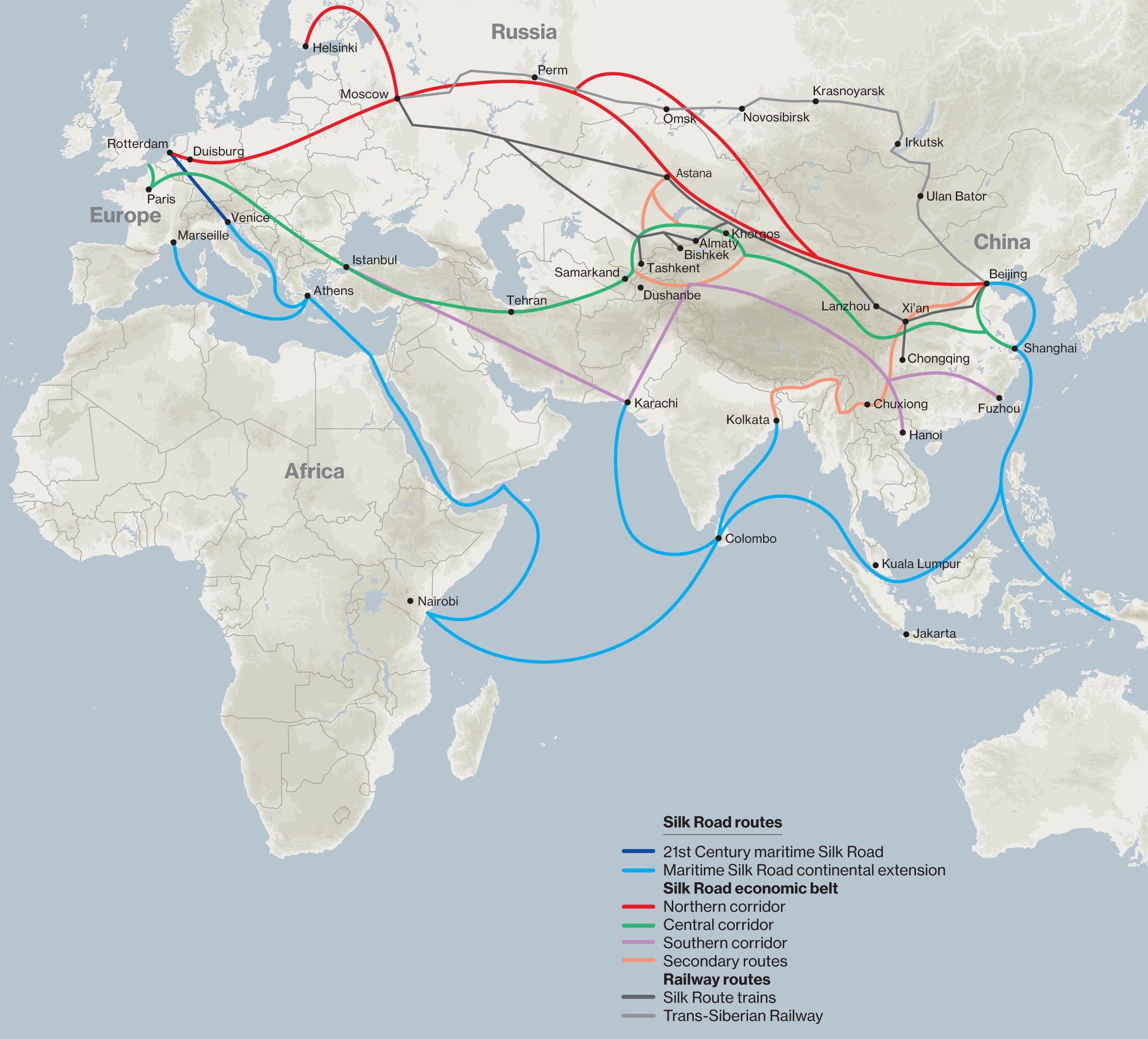 - un corridor de la Chine vers l’Europe occidentale, et notamment Duisbourg, Hambourg, Rotterdam, Lyon et Madrid ;