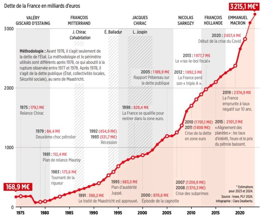 A ce jour, la dette publique française a atteint un nouveau sommet historique de 3303 milliards d’euros au troisième trimestre 2024. Elle représentait 14,5 % du PIB en 1974, 20 % en 1980, 60 % en 1999, au moment du passage à l’euro, et 113,7 % fin 2024. De 2020 à 2022, la charge d’intérêts de la dette a augmenté de 19 Md€ du fait de l’augmentation du stock de dette (440 Md€ de fin 2020 à fin 2023), de la hausse des taux de marché et de la reprise de l’inflation. « Alors que la charge d’intérêts de la dette publique française représentait 29 milliards d’euros en 2020, elle devrait atteindre environ 58 milliards en 2024, soit davantage que le budget des armées, puis environ 80 milliards en 2027, presque autant que le budget de l’Éducation nationale », avertissait en avril 2024 le gouverneur de la Banque de France.