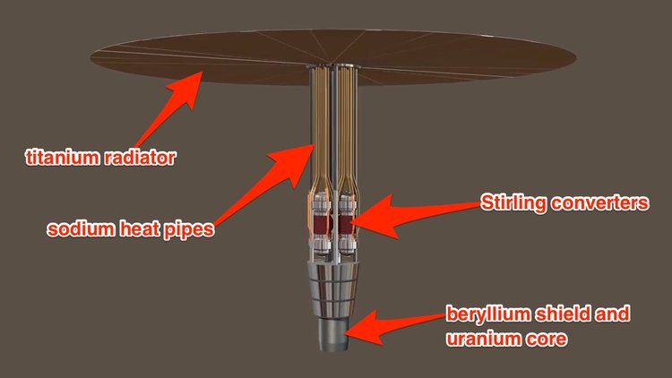 A partir de l’uranium-235 métal, le réacteur émet, lors d’une réaction de fission nucléaire, des neutrons et de la chaleur convertible en électricité, grâce à un appareil dit « moteur Stirling », un moteur à combustion externe connu depuis très longtemps.