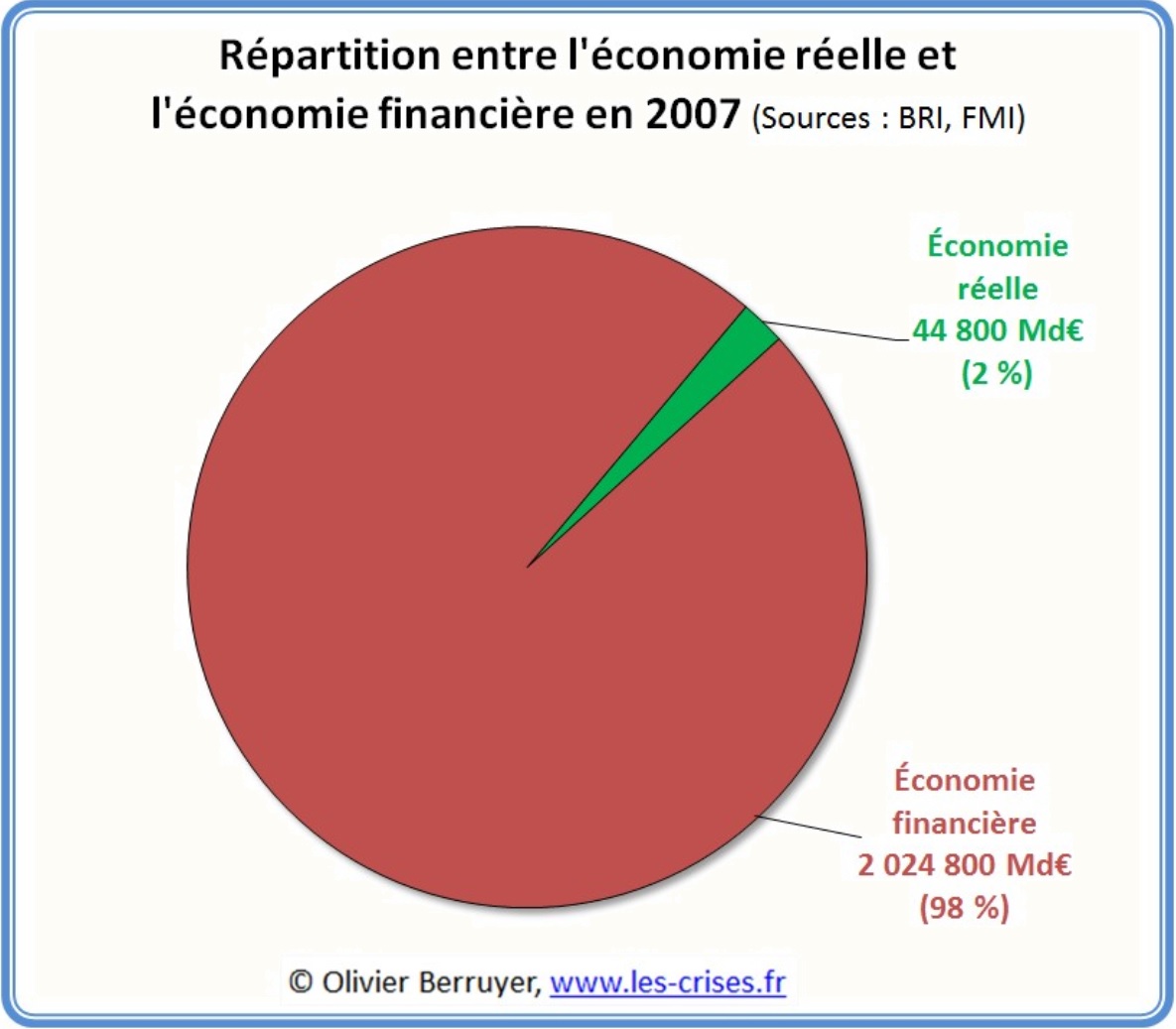 - Le shadow banking, des marchés de gré à gré totalement en dehors de toute régulation et rendu possible par les directives européennes, représente au moins 92000 milliards de dollars, à comparer avec le PIB mondial (70 000 milliards de dollars) ;