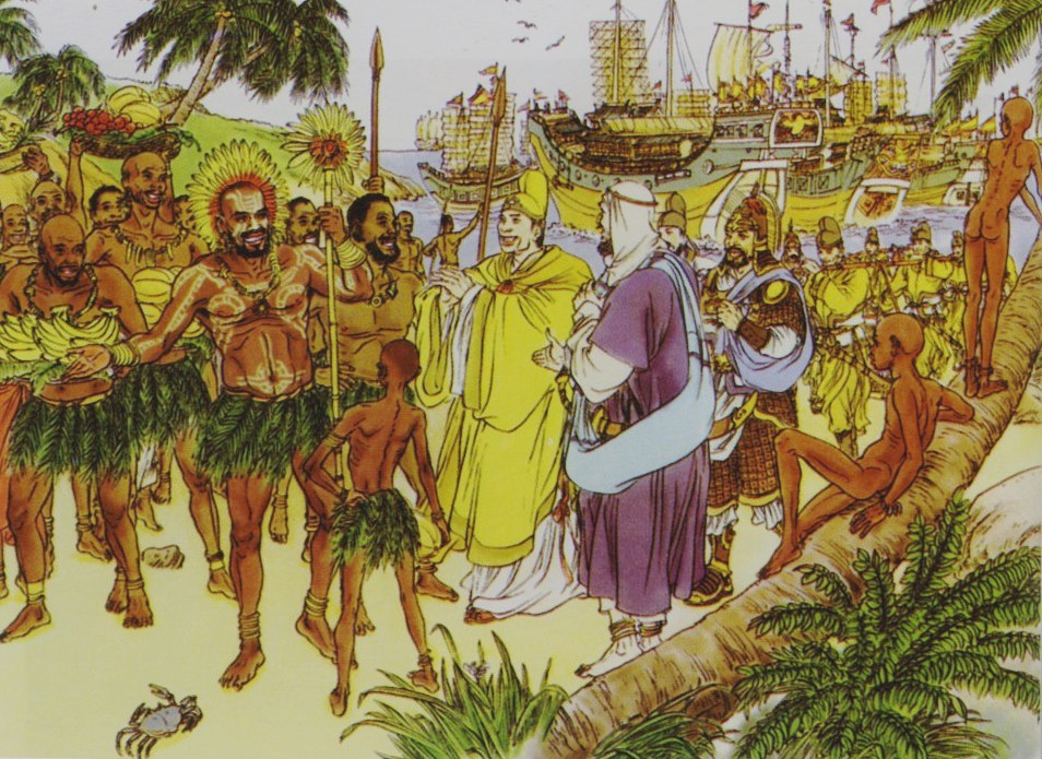 Lors de sa quatrième expédition, affirme le National Geographic, Zheng rencontre des représentants du Sultanat de Malindi (actuel Kenya) avec qui la Chine a établi des relations diplomatiques en 1414 dans le cadre très original du « système tributaire chinois. »