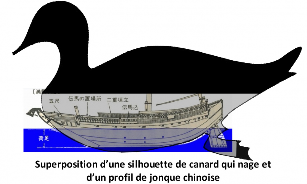 Cependant, les Chinois remarquent que le poisson qui nage sous l’eau ne peut être un exemple pour évoluer sur l’eau. Leur animal de référence est le canard. Point d’étrave quand il suffit de survoler la surface. La jonque fut donc conçue suivant la forme de cet oiseau marin. De celui-ci, elle reprend son allongement, son très faible tirant d’eau sur l’avant de la carène et sa grande largeur.
