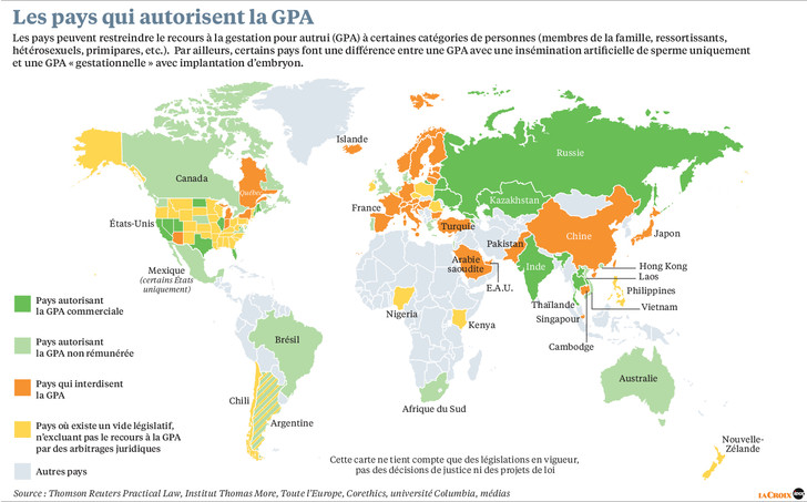 Pour l’instant, contrairement aux Etats-Unis et à la plupart des pays européens, la GPA est encore interdite en France (voir encadré). Or, l’appareil législatif des Etats-Unis est la référence pour une GPA internationale qui va à l’encontre des traités internationaux sur la protection des droits de la femme et de l’enfant.