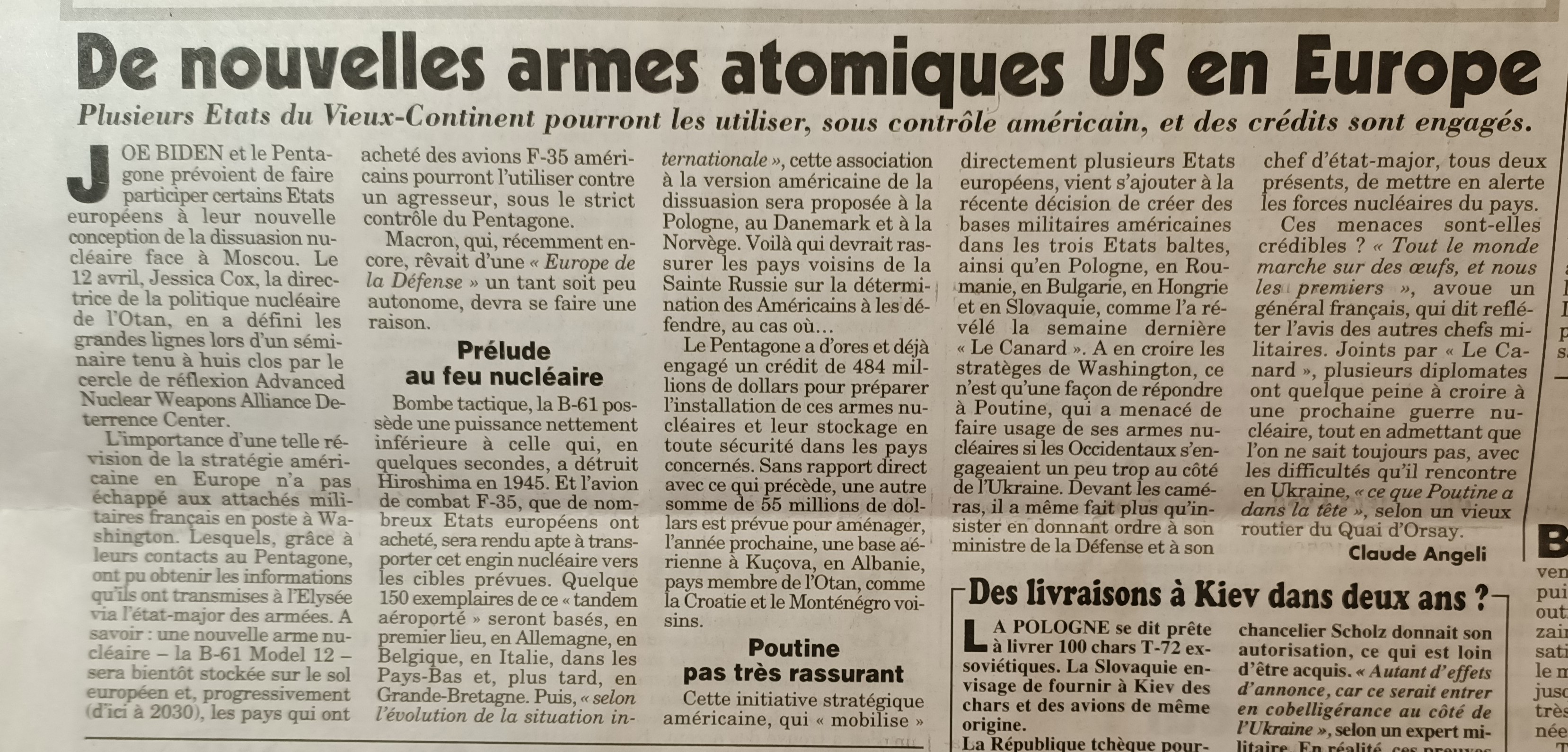 Dans son article du 20 avril intitulé « De nouvelles armes atomiques US en Europe », Claude Angeli, le rédacteur-en-chef du Canard enchaîné, révèle que des attachés militaires français en poste à Washington ont assisté dans la capitale américaine à un séminaire à huis clos de l’Advanced Nuclear Weapons Alliance Deterrence Center, un groupe de réflexion américain.