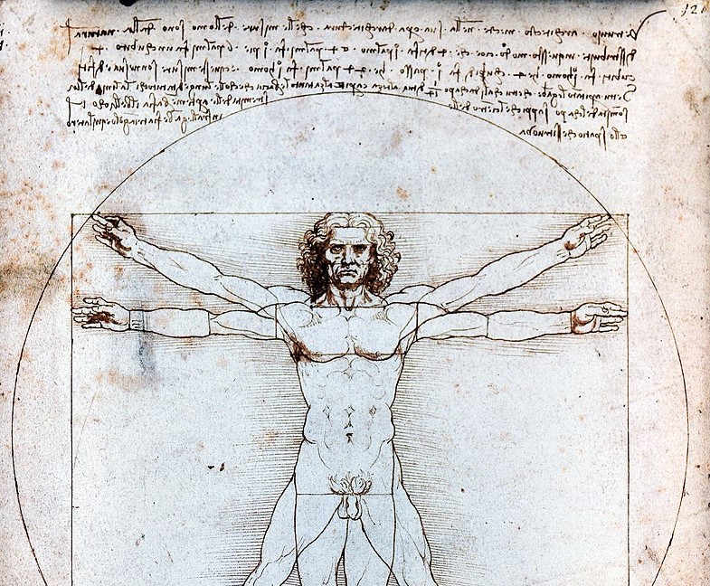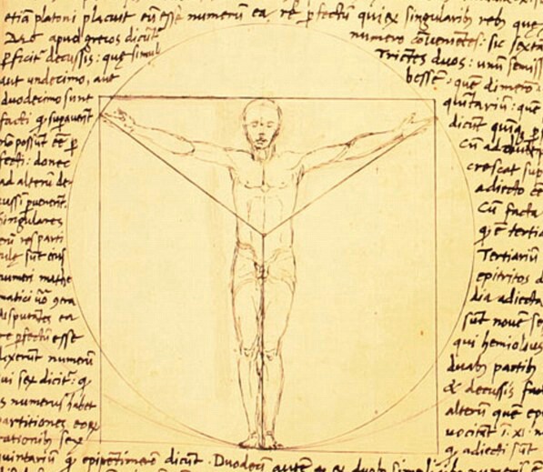 Sans doute inspiré par son ami, l’architecte Giacomo Andréa, dans « l’Homme de Vitruve », Léonard s’intéresse avant tout à d’autres harmonies : si une personne étend ses bras en direction parallèle au sol, l’on obtient la même longueur que toute sa taille.