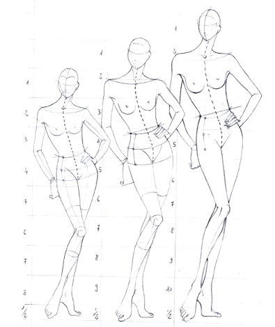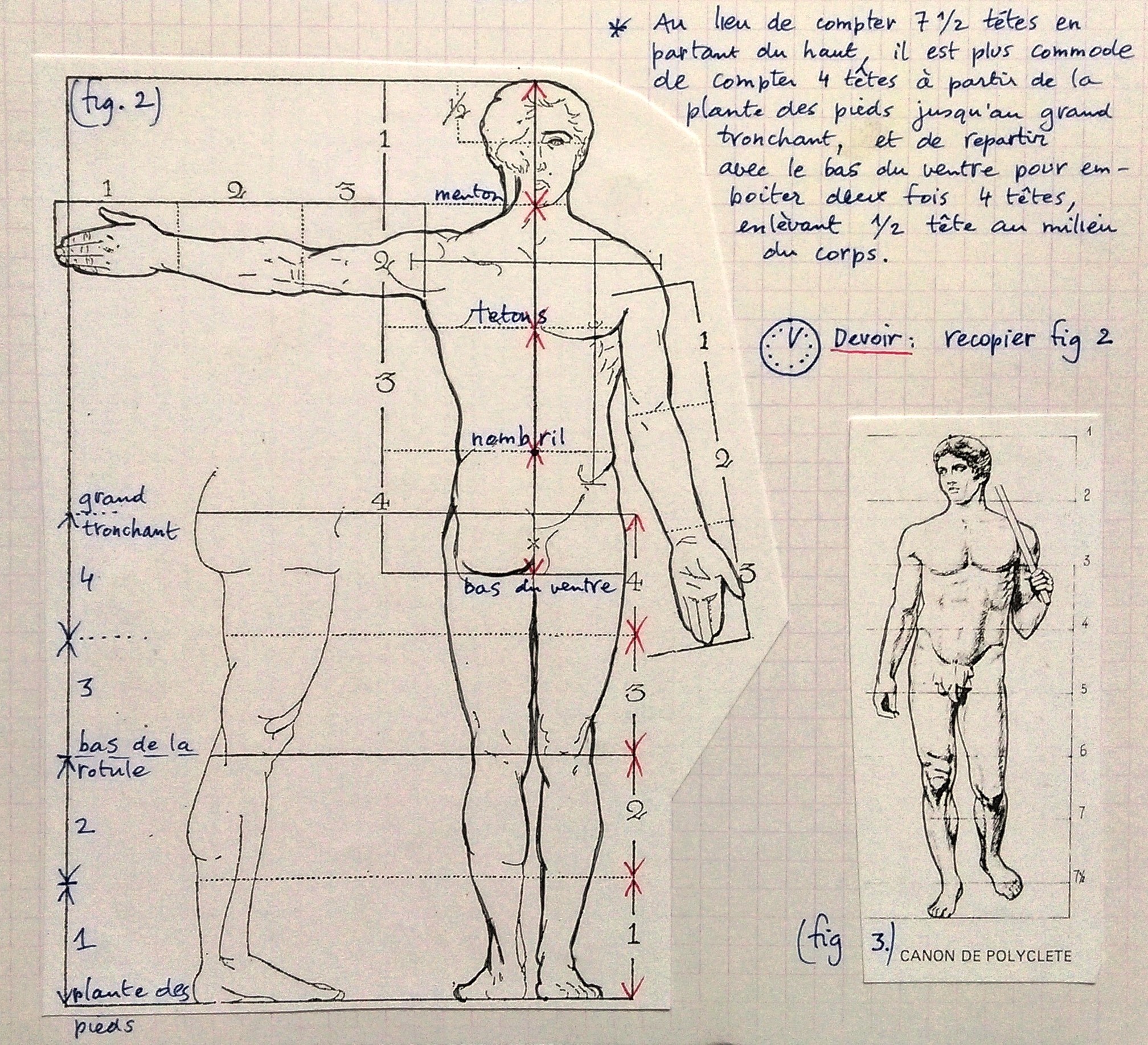 Ces deux fois quatre têtes s’emboîtent au milieu de notre corps d’une demie tête, ce qui donne, non pas huit, mais 7 ½ têtes au total. Ces tailles varient proportionnellement avec la taille du corps et toute disproportion provoque assez vite un sentiment de monstruosité.