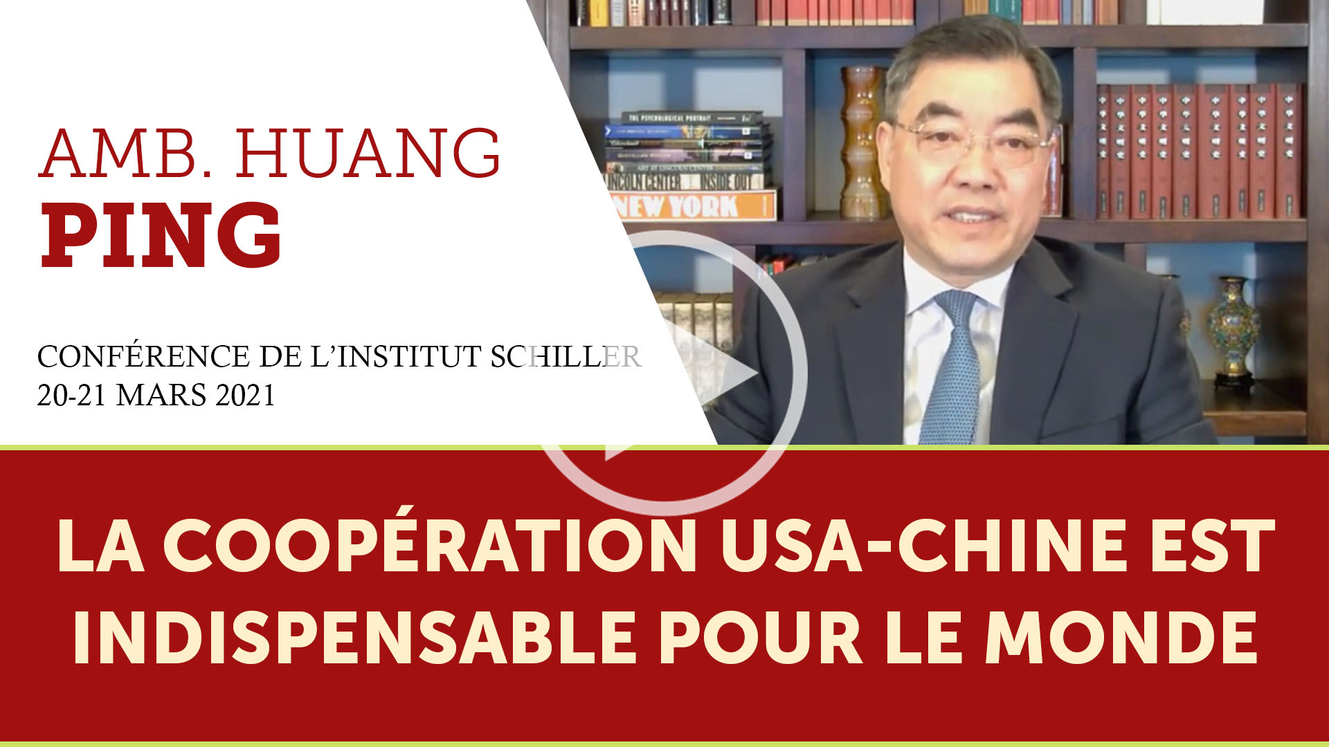 Intervention de S.E. Huang Ping, Consul général de la République populaire de Chine à New York, lors de la visioconférence de l’Institut Schiller des 20 et 21 mars 2020 sur le thème : « Deux mois après l’investiture de Biden, le monde à la croisée du chemin. »