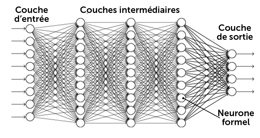 Des algorithmes simples qui captent les signaux binaires en entrée pour en restituer d’autres en sorties. Dans son estomac, un très grand nombre de ces neurones (plusieurs millions, voire milliards) s’organisent en couches successives communiquant les unes avec les autres.