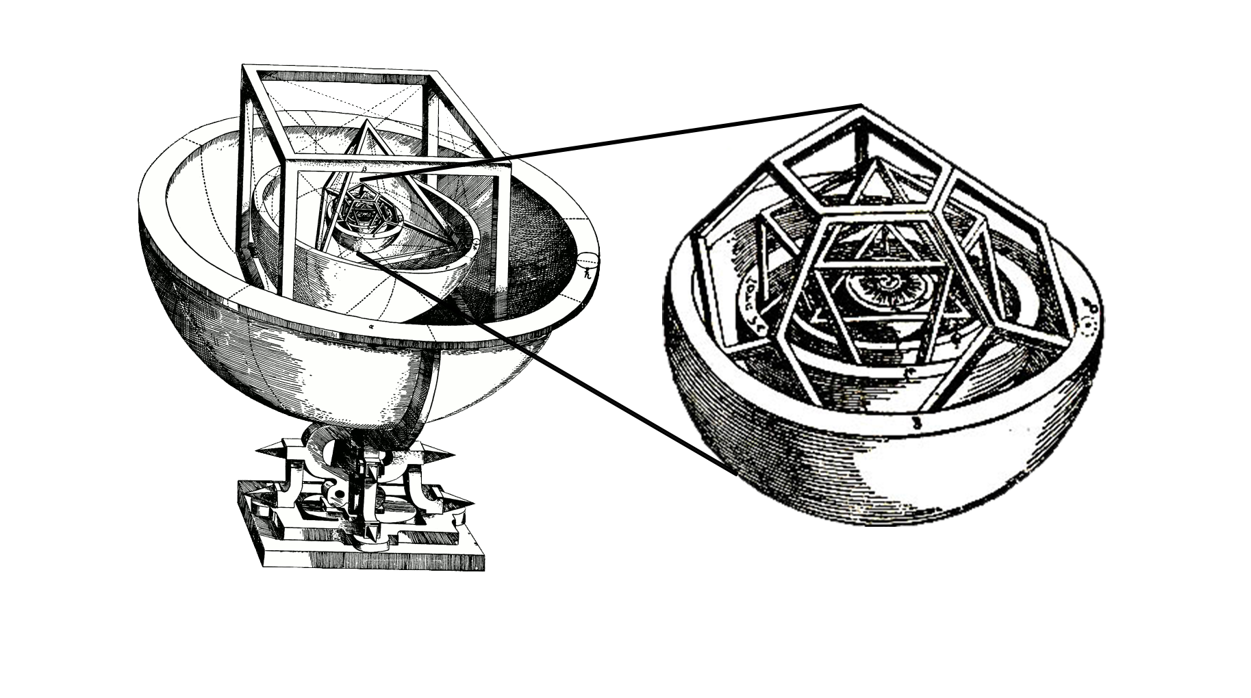 C’est ici que Kepler entre en jeu. Ce qu’il fait, dès le départ, c’est chercher non seulement à comprendre « comment » fonctionne le système solaire mais bien plus encore « pourquoi » il s’organise ainsi et pas autrement. Cette approche le mène à concevoir un premier modèle d’une originalité sans pareil situant le Soleil au centre et corrélant l’organisation des six orbites planétaires connues à l’époque avec les sphères inscrites et circonscrites des cinq solides platoniciens ordonnés harmoniquement