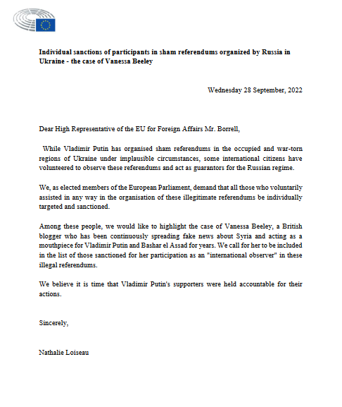 Loiseau a ciblé Vanessa Beeley, une journaliste britannique qui s’est rendue dans la région pour surveiller le vote. Poussant sa plainte bien au-delà du référendum, l’eurodéputée française a accusé Mme Beeley de « diffuser continuellement des fausses nouvelles sur la Syrie et de servir de porte-parole à Vladimir Poutine et à Bachar el Assad depuis des années ».