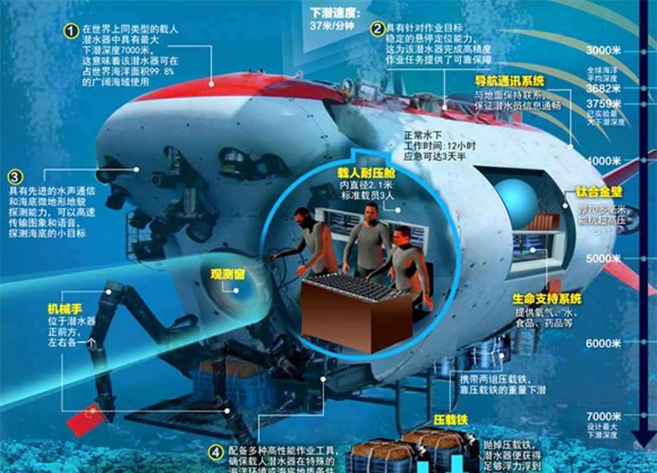 Fruit d’une volonté politique incomparable et d’un énorme effort de R&D organisé depuis 2003 par une centaine d’instituts de recherche, le sous-marin habité chinois Jiaolong, quelques mois après une première plongée de 3759 mètres de fond en mer de Chine méridionale, a pu réaliser en 2012 une plongée record à 7062 mètres de profondeur dans la fosse des Mariannes.