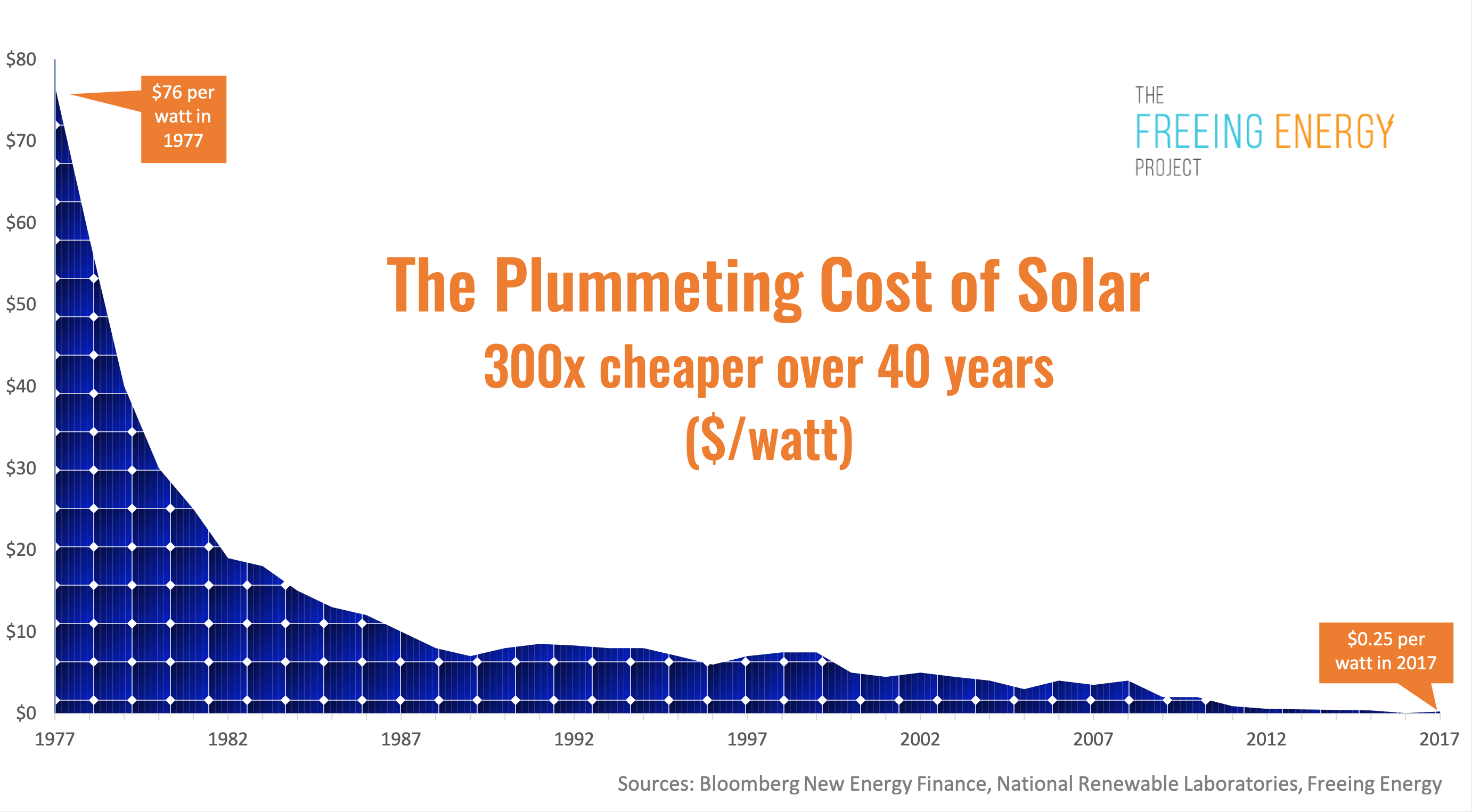 Certes, une partie des profits réinvestis dans leur efficacité et la production en masse de ces technologies ont permis d’en baisser le coût de fabrication. Le coût de production d’une cellule photovoltaïque est passé de 76 dollars en 1977 à 0,3 dollar en 2015 et les moteurs des éoliennes géantes ont gagné en performance.