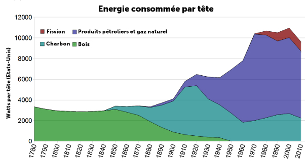 Comme on le voit sur la figure 1 (les données sont fournies ici pour les Etats-Unis mais reflètent le même processus dans les autres pays), au cours de l’histoire des pays industrialisés, la densité du flux d’énergie (exprimée ici par la consommation par tête) a doublé trois fois en un peu plus de deux siècles (entre 1750 et le début des années 1970). L’on est ainsi passé – et à chaque fois avec une plus grande densité par gramme de matière première et une température de combustion plus élevée – du bois au charbon, puis aux produits pétroliers et enfin à la fission nucléaire. Dans chacune de ces trois transitions, la consommation d’énergie par tête a essentiellement doublé, ce qui a permis à tout individu actif dans notre société de devenir de plus en plus productif.