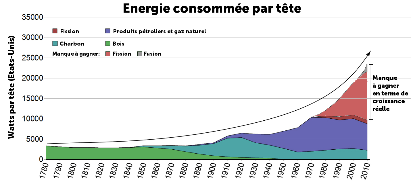 On voit aussi sur la figure 1 que la fission n’a pas joué pleinement le rôle qui lui était dévolu. C’est ce qui est illustré par un aplatissement de la courbe : un processus d’effondrement généralisé s’est peu à peu installé dans les économies occidentales.