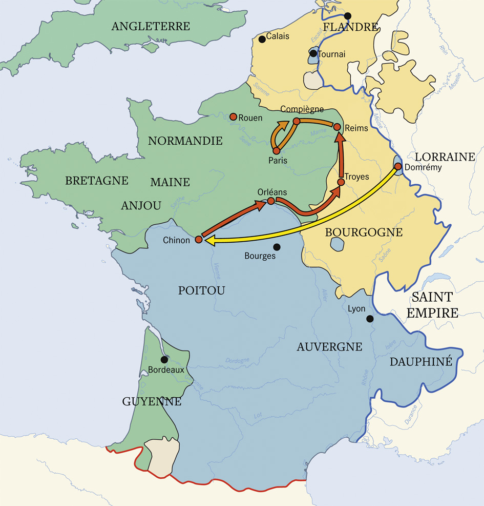 Jeanne quitte alors Domrémy pour se rendre auprès du Dauphin, au sud de la Loire. Pour y arriver, elle doit traverser des territoires occupés par les Anglais. A Chinon, elle obtient une audience avec le Dauphin. Après plusieurs semaines, elle le convainc de lui confier les armes et les troupes requises pour lever le siège des Anglais de la ville d’Orléans, dernier bastion de résistance française face à l’invasion anglaise.
