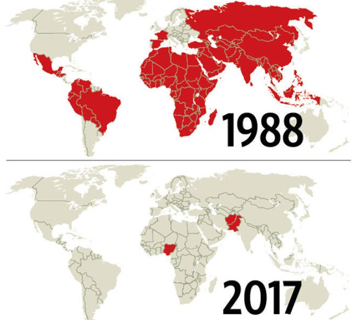 Un énorme effort de vaccination a permis de réduire le nombre de cas de poliomyélite, de 350 000 dans 125 pays en 1988 à seulement 33 cas confirmés en 2018, mais repassant à 175 cas en 2019, principalement au Pakistan, au Nigéria et en Afghanistan.