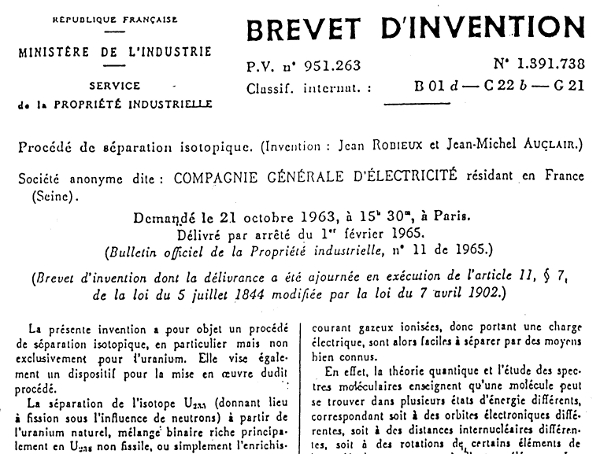 Le 21 octobre 1963, le brevet d’invention n°1391738 a été déposé pour un « Procédé de séparation isotopique », « ayant pour objet un procédé et un dispositif permettant d’ioniser sélectivement un composé gazeux isotopique ». A l’origine du brevet, le chercheur de génie Jean Robieux, le « père de la fusion par laser », qui nous avait honoré de sa présence avec un bel exposé lors d’une assemblée générale de Solidarité & Progrès en 2010.