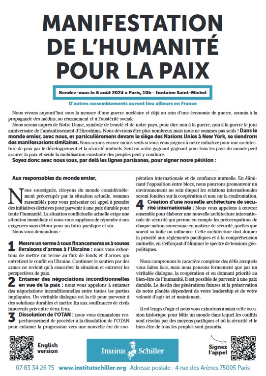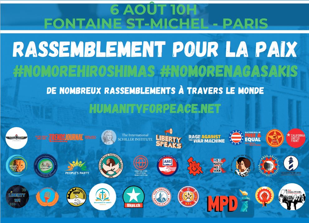 Vous êtes ainsi invité(e) à rejoindre le rassemblement que l’Institut Schiller organise à Paris le dimanche 6 août et le mercredi 9 août. Plus d’informations ci-dessous (à la fin du communiqué de la coalition Humanity for Peace).