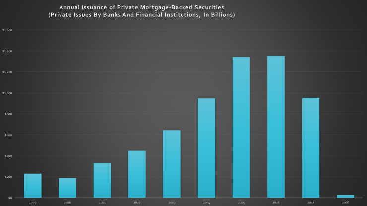 Stanley montra ensuite deux graphiques : l’un illustrant la croissance des titres adossés à des créances hypothécaires (de 200 milliards à l’époque de la révocation à 1300 milliards six années plus tard) et l’autre montrant la croissance, après la révocation du Glass-Steagall, des titres et obligations adossés à des actifs (ABS, CDO), puis leur effondrement lors du krach, de deux bons tiers de leur « valeur ».