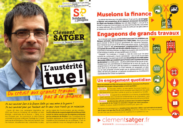 Vous pouvez lire sa profession de foi « L’austérité tue ! Du crédit aux grands travaux pas à la finance ! » sur son blog de campagne : clementsatger.fr