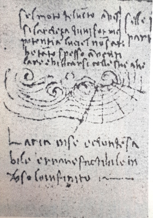 Léonard établira que ces deux types de propagation des ondes, par cercles concentriques ou par tourbillons ou vortex, se produisent aussi dans l’air, bien que différemment, car l’air est compressible. Ici, son dessein sur les vortex qui se forment sur les ailes et le dos des oiseaux lorsqu’ils prennent leur envol. (Fig. 4).