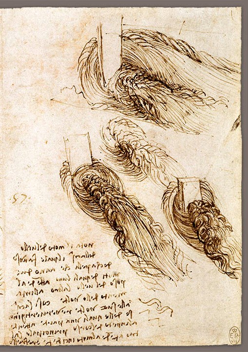 Si vous jetez une feuille par-dessus, vous verrez qu’elle ne bouge pas. Rien à voir avec les vagues déferlantes qui, avec leur force, portent les surfeurs, phénomène que De Vinci avait étudié comme on le voit dans ce dessin. (Fig. 3) !