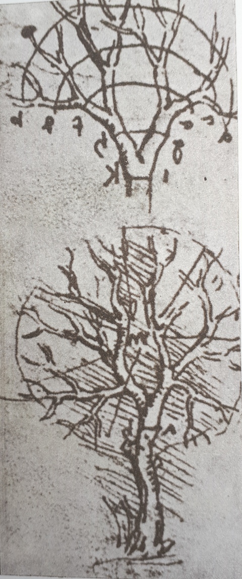 Léonard se pencha aussi sur d’autres phénomènes particulièrement intéressants qui trouvent aujourd’hui leur pleine application, notamment la géométrie de la croissance des arbres et des os. Il établit la règle de l’égalité du diamètre du tronc d’un arbre et de la somme des diamètres de ses branches secondaires, à quelque niveau de ramification que l’on se place (Fig. 12).