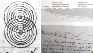 Prenons ses études sur la propagation des ondes dans deux fluides, l’air et l’eau, qu’on peut considérer comme précurseurs de l’hydrodynamique moderne. Jetez une pierre dans l’eau et observez, comme Léonard, ce qu’il s’y passe. Des cercles concentriques se forment autour de son point de chute. Ils s’étendent sur la surface de l’eau et peuvent même s’entrecroiser avec d’autres sans se briser ; ils ne transportent pas cependant de la matière (Fig. 2).