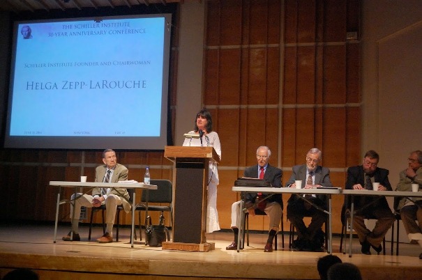 Si j’ai donné le nom de Friedrich Schiller à ce mouvement consacré à bâtir la paix, a expliqué madame LaRouche, c’est parce que ce grand poète et dramaturge était convaincu que chacun a le potentiel de devenir une âme noble, et aussi un génie. C’est pourquoi j’ai décidé que la politique étrangère ne devait pas être laissée aux manipulateurs et autres auteurs de coups fourrés, comme elle l’est aujourd’hui. Chaque nation devrait dialoguer avec toutes les autres au niveau le plus élevé de la science et de la culture, comme l’ont fait les grands politiques et savants européens et américains. L’Institut Schiller a été fondé les 3 et 4 juillet 1984 par 1200 délégués de 50 nations, chacun ayant apporté son drapeau et son hymne national, mais tous étant unis sous la bannière : Voici venu le temps de Schiller !