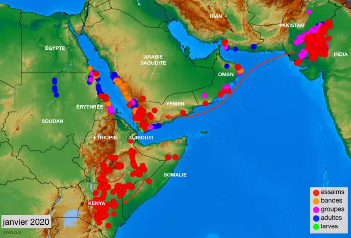 En juin, les premières invasions dans la Corne de l’Afrique ont commencé. Le nord de la Somalie a été la première région touchée, puis l’Ethiopie. Ces deux pays sont parvenus à contenir la formation des bandes larvaires et des essaims jusqu’au mois de décembre. Puis tout a basculé avec l’arrivée du cyclone Pawan, le 7 décembre, sur le nord-est de la Somalie. Des pluies abondantes et des inondations ont gagné l’intérieur des terres, jusqu’en Ethiopie, favorisant la reproduction. La situation est devenue hors de contrôle ».