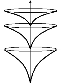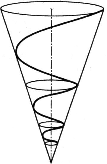 Pour intégrer cette partie du processus, il dut remplacer le cône par un hyper-cône, représentant l’épuisement du processus, l’hyper-cône s’évasant au fur et à mesure de sa croissance et s’étalant horizontalement vers l’infini sans continuer à s’accroître verticalement (Fig. 3).