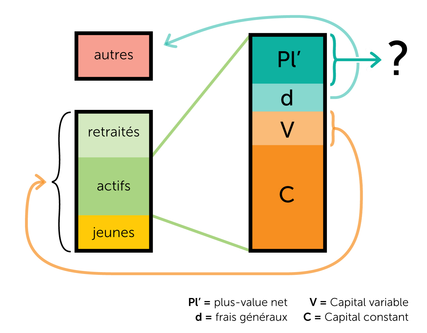 Enlevons C et V de la production totale (T), il nous reste l’excédent Pl (plus-value), la marge brute d’exploitation dans le système de production. Pl = T- (C+V).