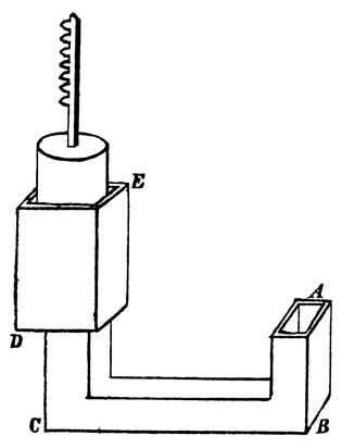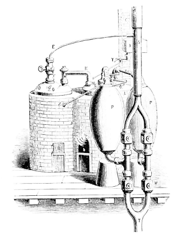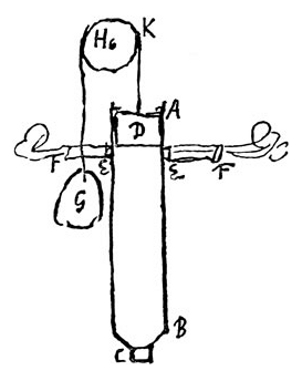 2. La cornue dispose d’une soupape de sûreté ab pour permettre une augmentation contrôlée maximale de la pression de la vapeur. On ouvre le robinet E, permettant ainsi à la vapeur sous pression d’envahir le cylindre.