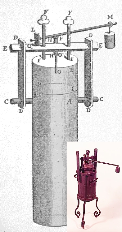 Vers 1680, Papin parvenait à des percées majeures afin de contrôler la vapeur sous pression, parmi lesquelles son « nouveau digesteur pour ramollir les os, etc. » – l’ancêtre de l’autoclave. Cet appareil est composé d’un cylindre aux parois épaisses (comme le prescrit Huygens dans son programme de 1666), dans lequel on met de l’eau, les os, la viande, etc. Après avoir refermé le cylindre, on peut commencer la cuisson en posant la « marmite » sur le feu (Figure 2).