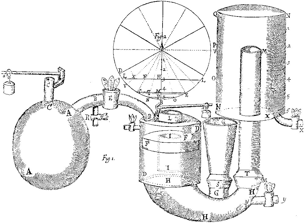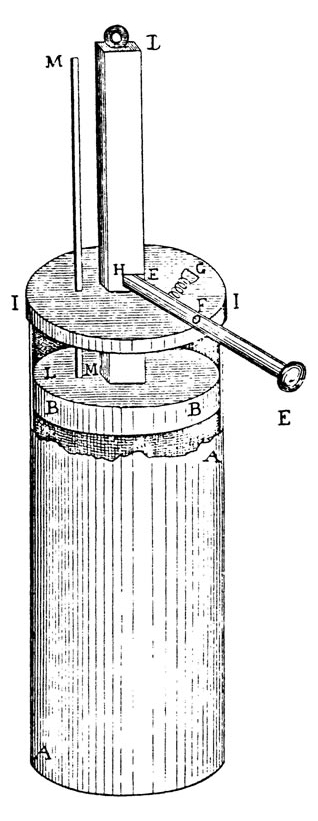 Huygens voulait utiliser le mouvement d’un piston pour accomplir un travail. Pour cela, il proposait de prendre un cylindre contenant un piston, sous lequel on créerait un vide par l’explosion d’une charge de poudre à canon à la base du cylindre (Figure 1). Une fois que l’air s’est échappé par deux valves de cuir qui, en se refermant, empêchent l’air de se réintroduire dans le cylindre, la pression atmosphérique fait descendre le piston dans le bas du cylindre. Après avoir réalisé une démonstration devant Colbert, Huygens écrit :
