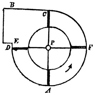 Ces choses ne sont pas vaines et ne se limitent pas à des arguties sur les mots, mais elles ont le plus grand emploi dans les machines pour comparer les mouvements. En effet, si quelqu’un a une force par l’eau ou par les animaux ou par une autre cause, au moyen de laquelle un corps grave de cent livres serait conservé dans un mouvement uniforme, par lequel à l’intérieur d’une minute de temps il pourrait délivrer la quatrième partie sur un cercle horizontal de trente pieds de diamètres ; assurément pendant ce même temps à sa place un autre poids double l’emporterait toutefois pour délivrer la moitié du cercle régulièrement par une moindre dépense, et cela te fera valoir un gain ; tu seras déçu et frustré de la partie moitié des forces ( ... ).
