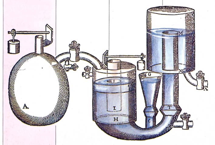 Leibniz se propose de démontrer que la force directe de la vapeur en dilatation, à l’opposé de la simple aspiration, est illimitée et qu’elle peut élever plus qu’une colonne d’air (28 août 1698) :