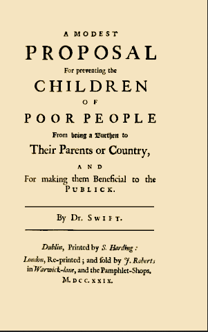 En 1729, Jonathan Swift, le grand écrivain et satiriste irlandais, auteur des contes de Gulliver, avait en effet publié un pamphlet satirique parodiant à l’extrême la pensée utilitariste et malthusienne (avant l’heure) qui dominait à l’époque l’aristocratie britannique vis-à-vis des populations pauvres, notamment irlandaises. L’objectif de cette « modeste proposition » était, comme le décrit l’intitulé, d’ « éviter que les enfants pauvres ne soient un fardeau pour leurs parents ou pour le pays, et pour les rendre utiles au public » !