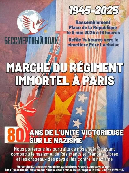 Solidarité & Progrès est l’une des six organisations [1] qui co-organisent la marche du Régiment immortel à Paris pour commémorer les 80 ans de la victoire sur le nazisme. Des rassemblements sont aussi prévus dans d’autres villes de France : Montauban, Montpellier, Strasbourg et Lyon. En mémoire de celles et ceux qui ont combattu, chacun est invité à participer à cette marche en portant un portrait d’un Résistant.