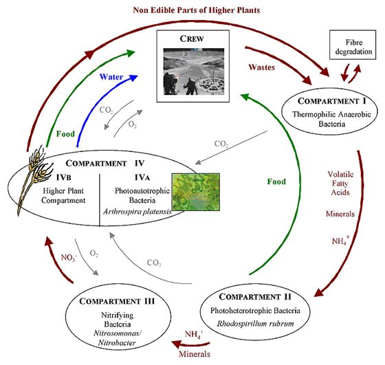 Parmi les projets en cours, le projet MELISSA (Micro-Ecological Life Support System Alternative), lancé en 1989 par l’Agence spatiale européenne (ESA). Scrutant les merveilles de la création, les chercheurs ont eu l’idée d’utiliser un ensemble de bactéries et de plantes afin de récupérer le dioxyde de carbone et les déchets de l’équipage pour en faire de l’air respirable et de la nourriture.