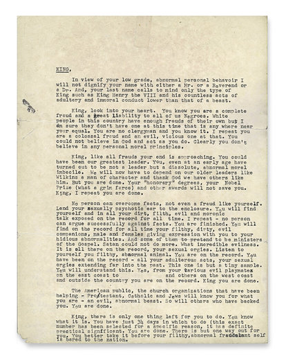 En novembre 1964, inquiet du rôle de l’avocat juif Stanley Levison, une des « plumes » de King, ami proche et ancien membre du Parti communiste américain, le FBI envoya au pasteur noir une lettre d’intimidation, accompagnée d’une cassette audio l’accusant d’avoir eu des liaisons extraconjugales. Ces enregistrements étaient le fruit de neuf mois de surveillance opérée par l’agent du FBI William C. Sullivan.