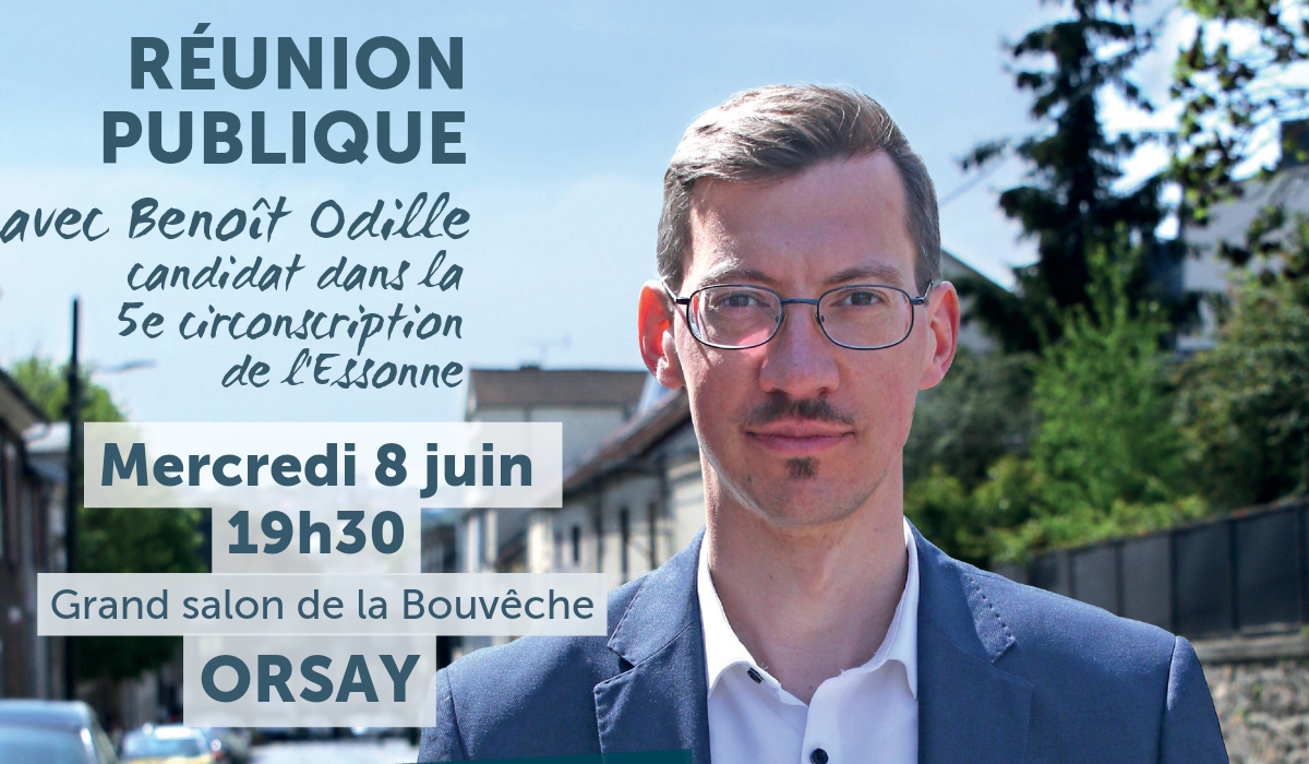 Benoît Odille, candidat dans la 5ème circonscription de l’Essonne et « youtubeur » avec S&P, vous invite à la réunion publique qu’il tiendra mercredi 8 juin à 19h30 à Orsay au Grand Salon de la Bouvêche. Venez nombreux !