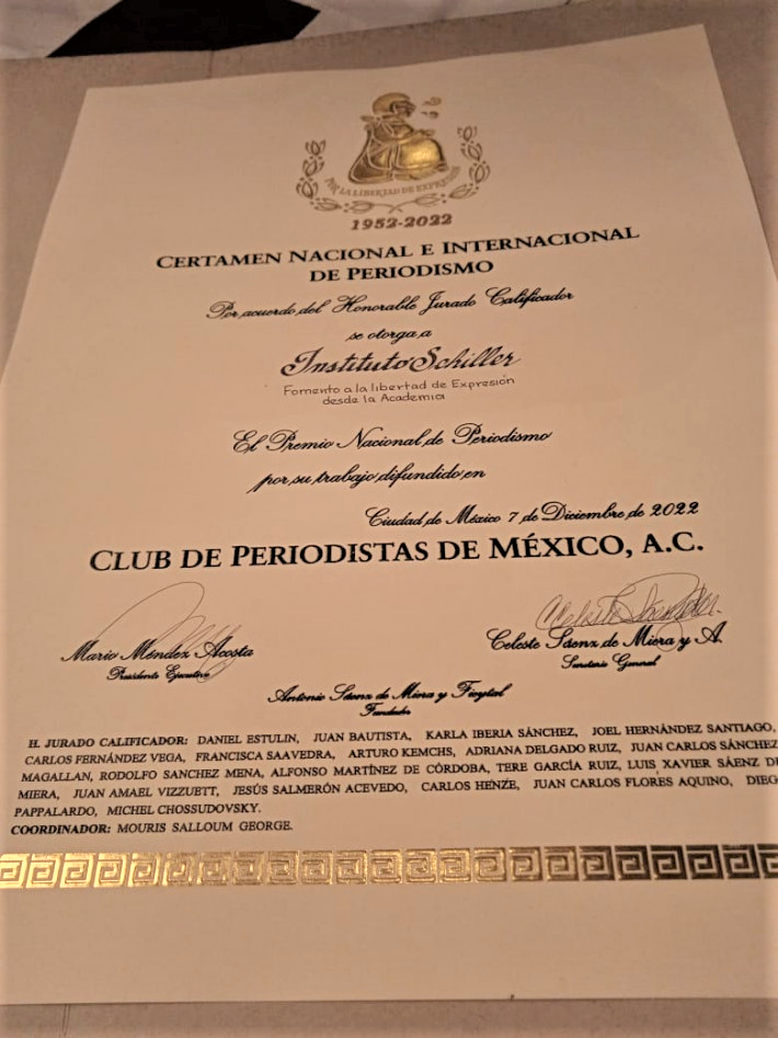 Le 7 décembre, c’est l’Institut Schiller qui s’est vu attribuer un des cinq prix internationaux pour son action visant à « favoriser la liberté d’expression dans le domaine académique, pour ses contributions à l’analyse historique et géopolitique visant à la compréhension des changements mondiaux d’un point de vue multidisciplinaire de la pensée critique, avertissant des conséquences de la violence et des déséquilibres qui affectent le concert des nations et la paix mondiale », ainsi que l’a précisé le maître de cérémonie. Une trentaine d’autres prix ont été décernés à des journalistes nationaux dans différents domaines.