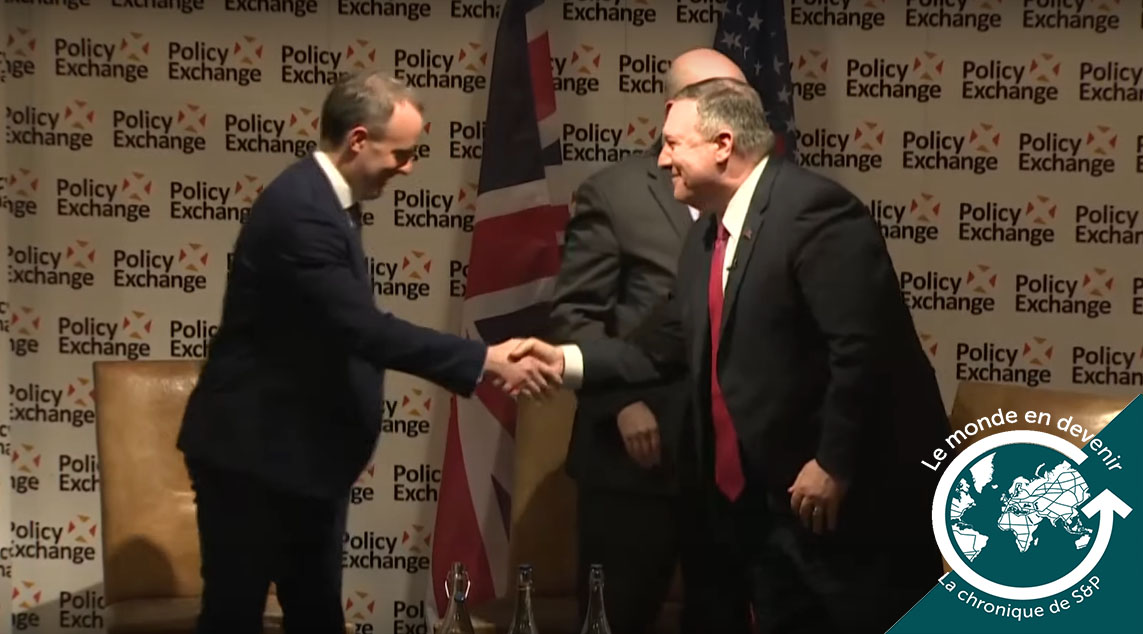 Quelques jours plus tôt, Pompeo était à Londres, où il a fait un certain nombre de rencontres très instructives pour comprendre le jeu qu’il joue au sein de l’administration Trump. Il s’est notamment entretenu avec son homologue britannique Dominic Raab, qu’il a gratifié d’un « Well done ! » pour la décision du Royaume-Uni de bannir la 5G de Huawei. La veille, Raab a annoncé devant la Chambre des Communes que son gouvernement allait suspendre « immédiatement et définitivement » le traité d’extradition avec Hong-Kong, et imposer un embargo sur les exportations d’équipements anti-émeutes pour protester contre la nouvelle loi de sécurité de Beijing.