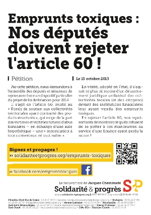 En effet, dans son article 60 du projet de loi de finances 2014 actuellement débattu à l’Assemblée nationale, le gouvernement, via l’incontournable agent des banques universelles Pierre Moscovici, veut interdire aux collectivités locales victimes des emprunts toxiques de poursuivre en justice les banques.